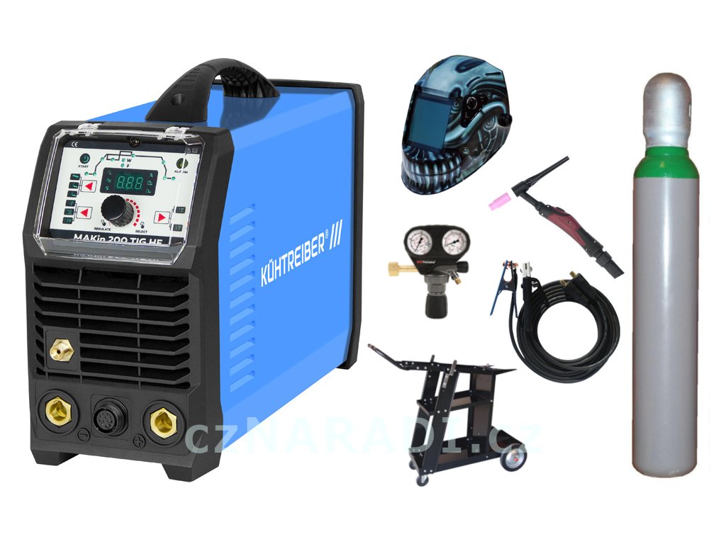 MAKin 200 TIG HF + kabely + TIG hořák + kukla Predator + ventil + lahev + vozík