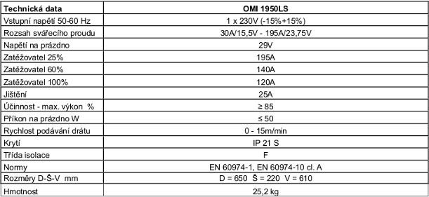 Synergický invertorový svářecí poloautomat OMI 1950LS umožňuje nastavení parametrů manuálně nebo pomocí synergie. Je možnost dále elektronicky nastavit délku bodu, hodnoty sváření dlouhými body či přepnout stroj do režimu dvoutakt nebo čtyřtakt. Digitální V-A metr. Dvoukladkový podavač svářecího drátu. Eurokoncovkou je možné připojení hořáků 3, 4, 5 m.